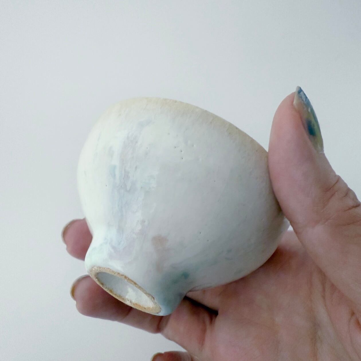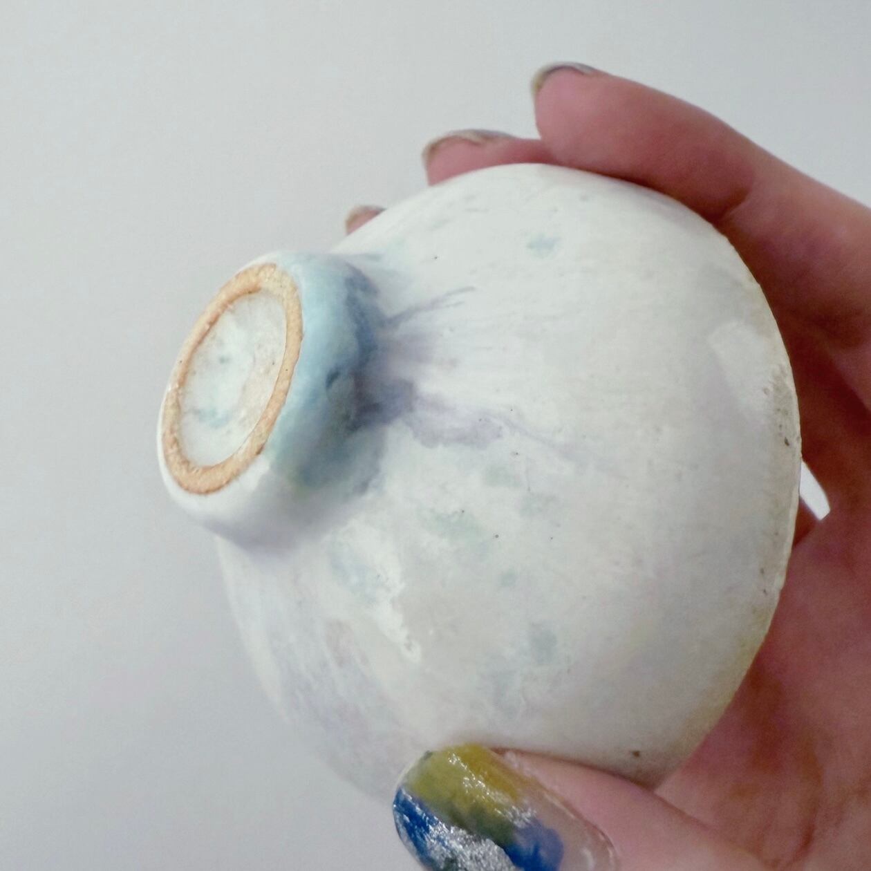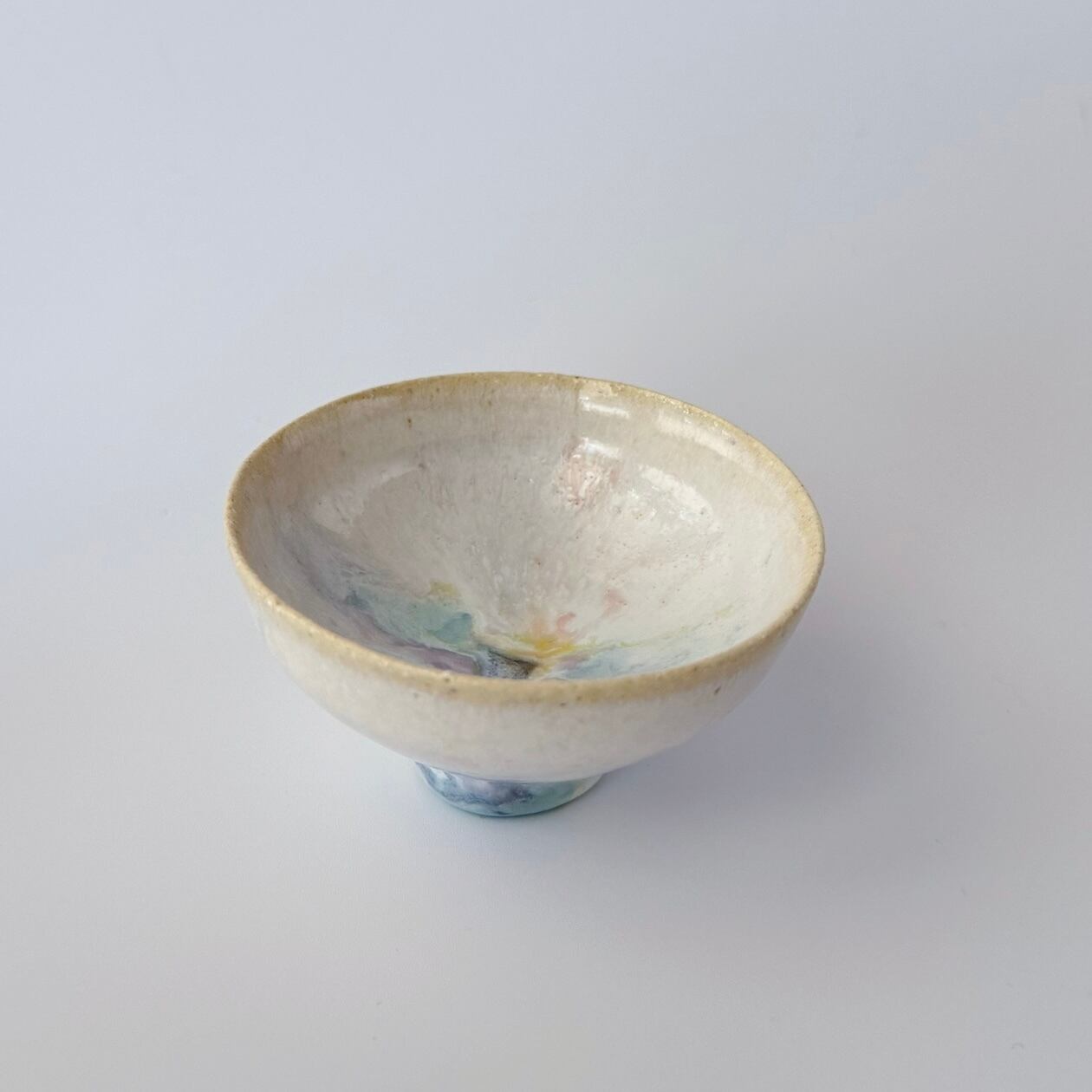 色とりどりの釉薬が溶け合い混ざり合う色が美しいおちょこです。
