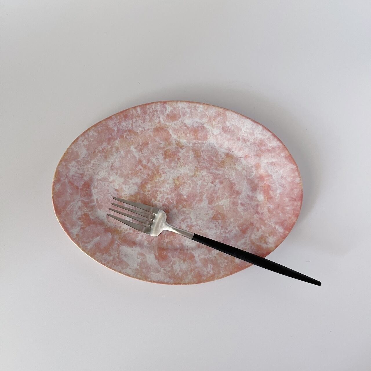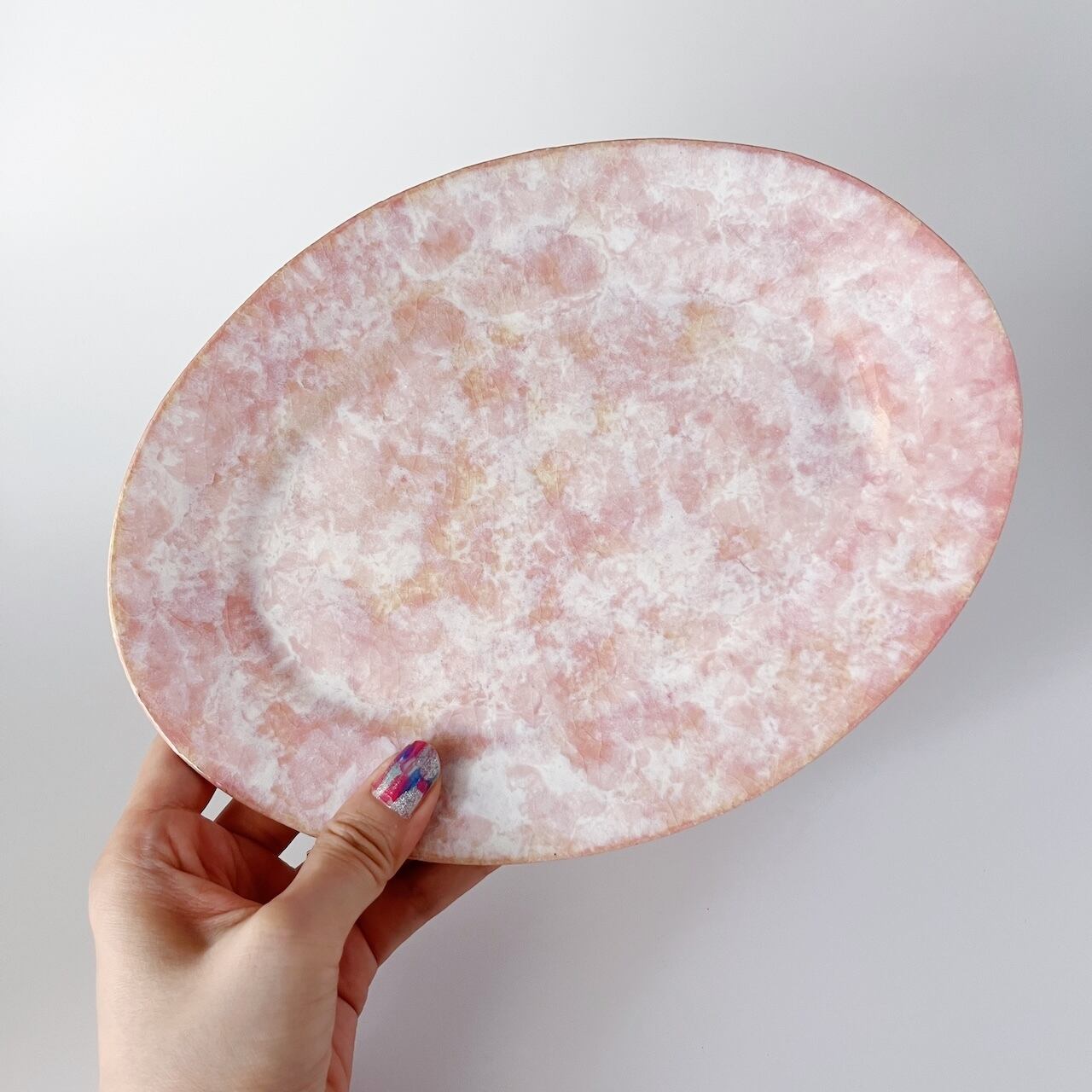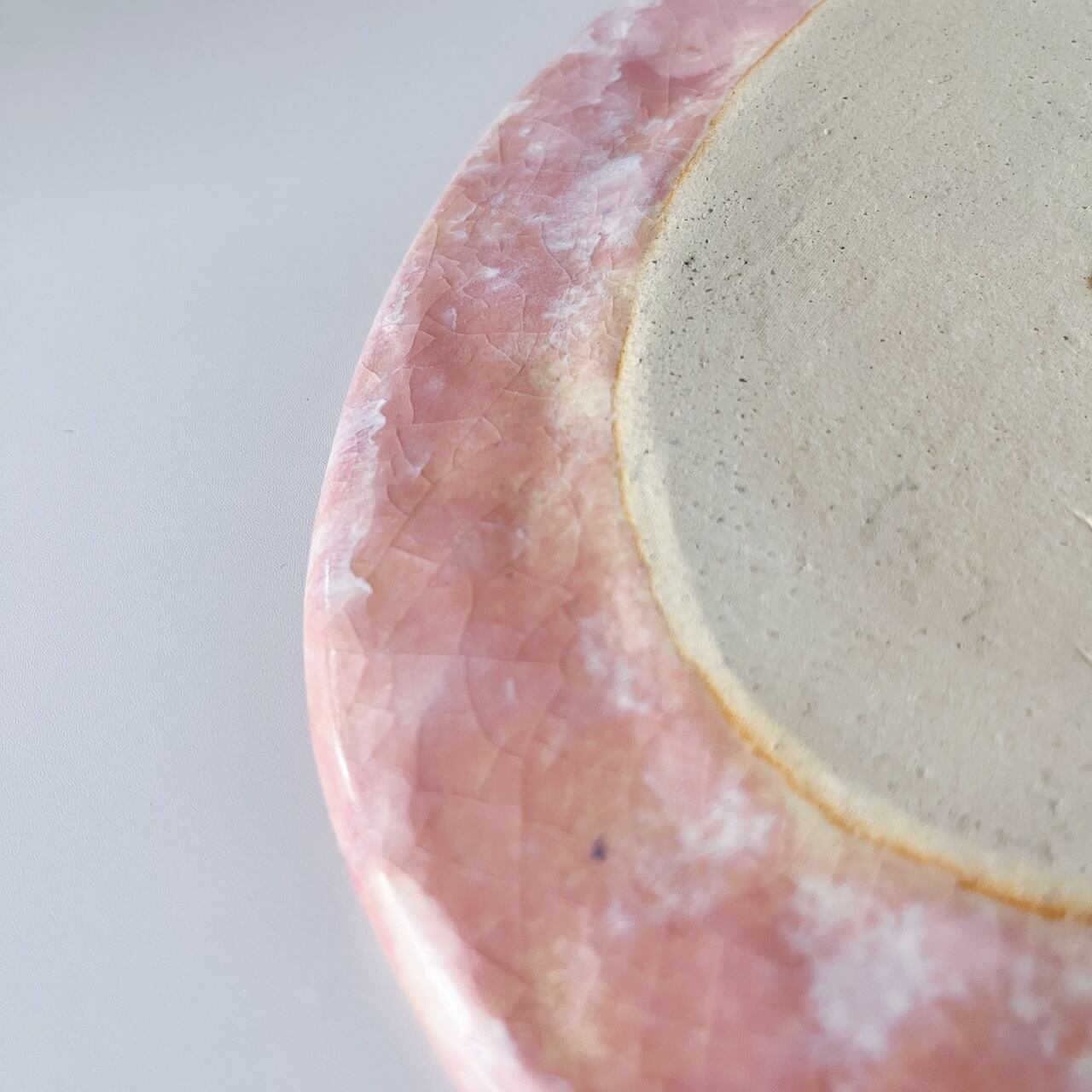 複数の釉薬を重ね掛けして、マーブルのように溶け合ったピンク色を出しています。