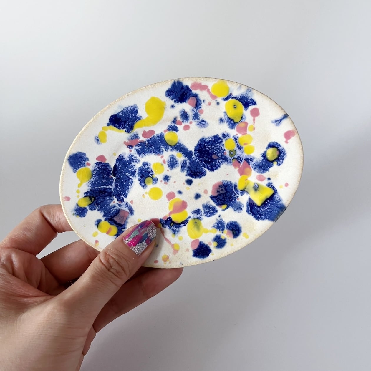 白地をベースに、青・黄色・ピンクの釉薬を垂らしてドット柄を作っているため、