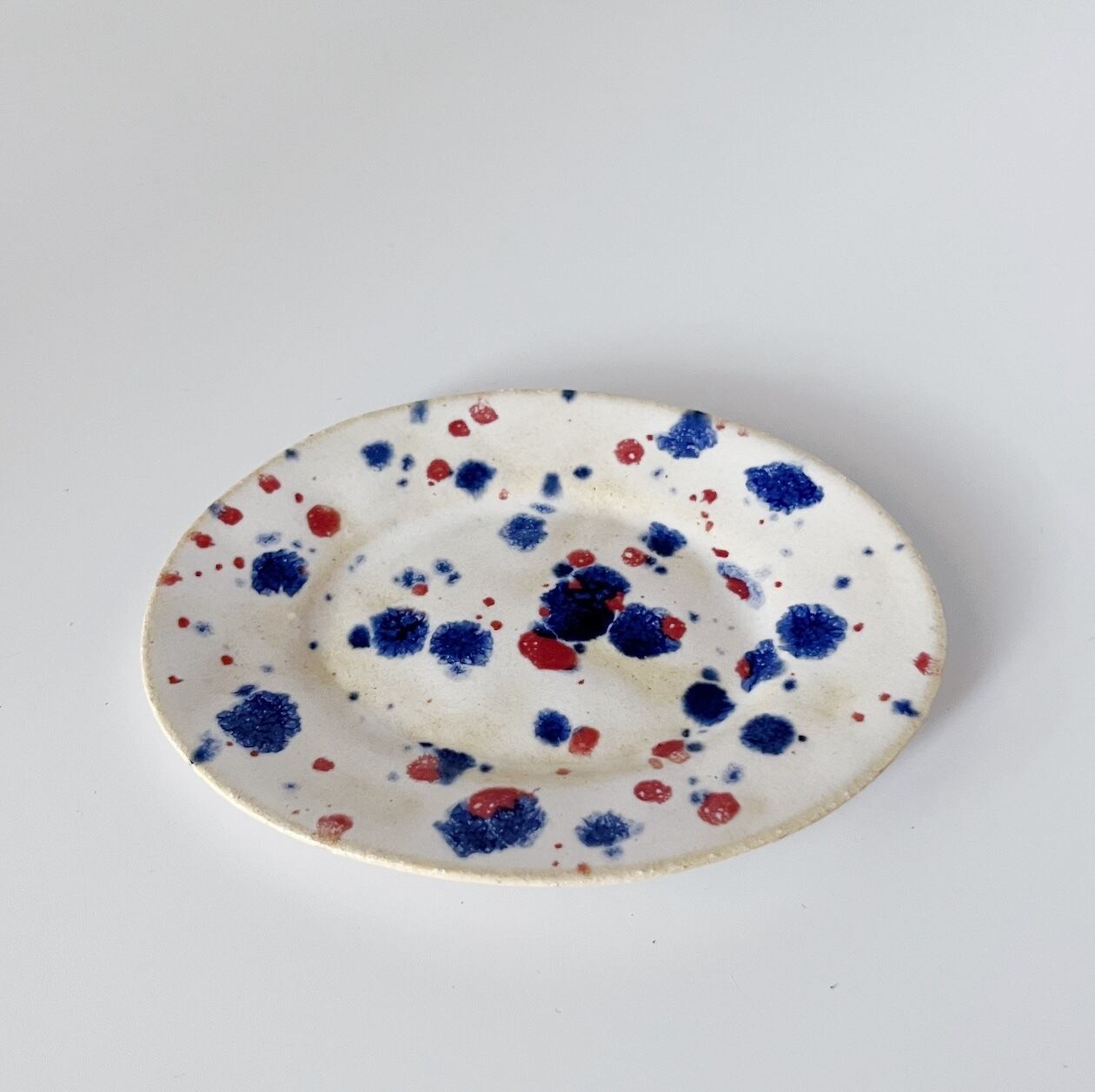 白地をベースに、青と赤の釉薬を垂らしてドット柄を作っているため、