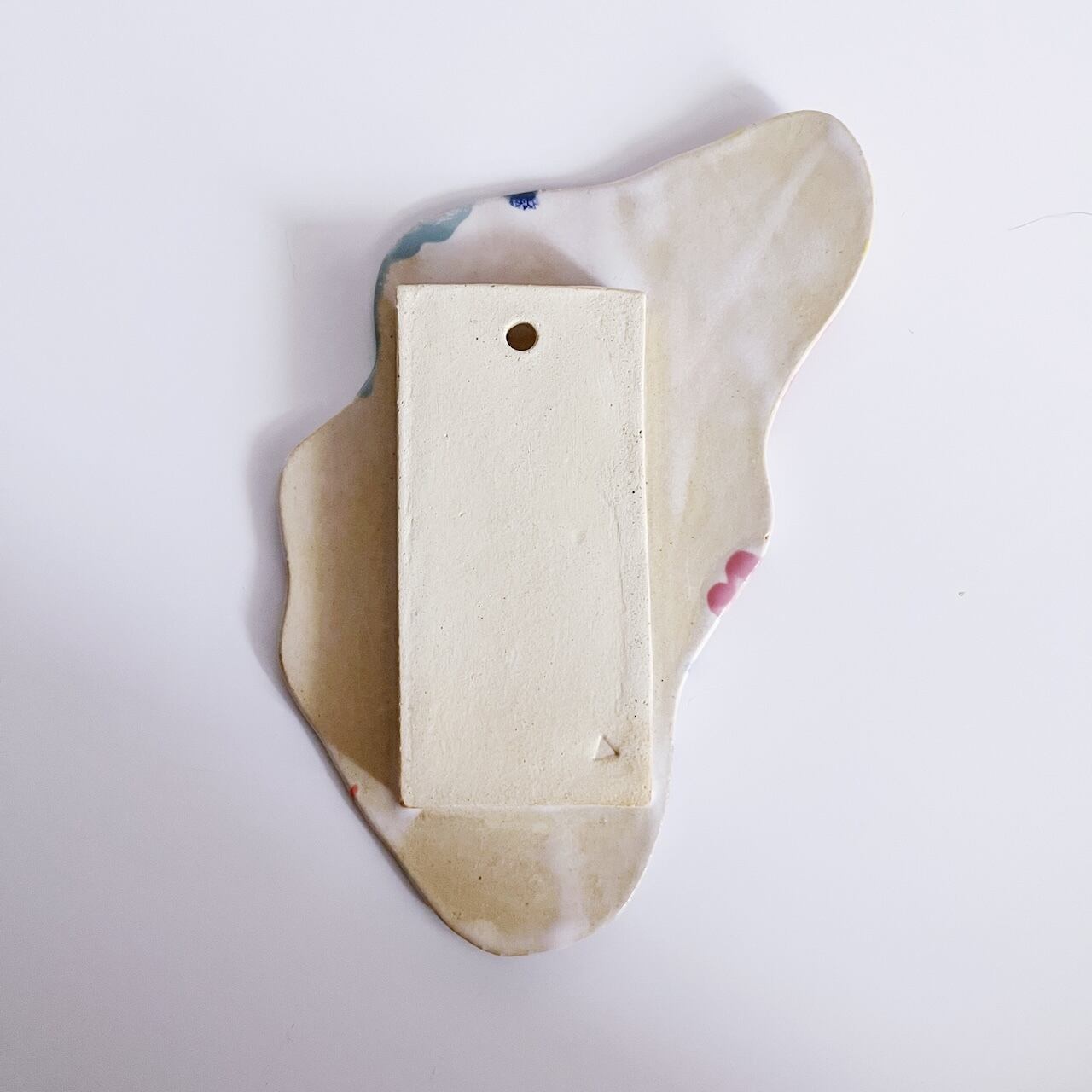 白地をベースに、青・黄色・ピンク・水色の釉薬をランダムにかけているため、