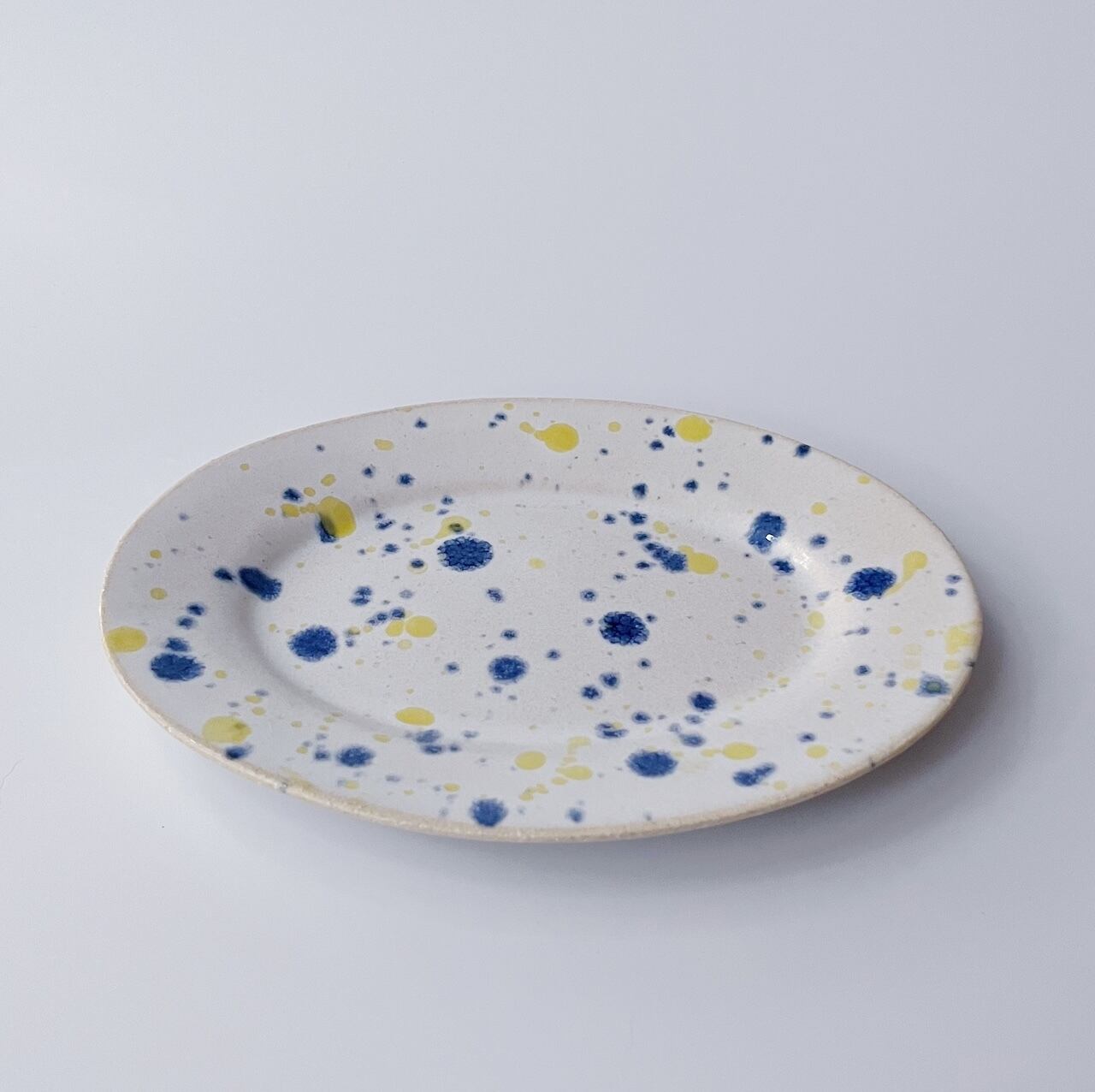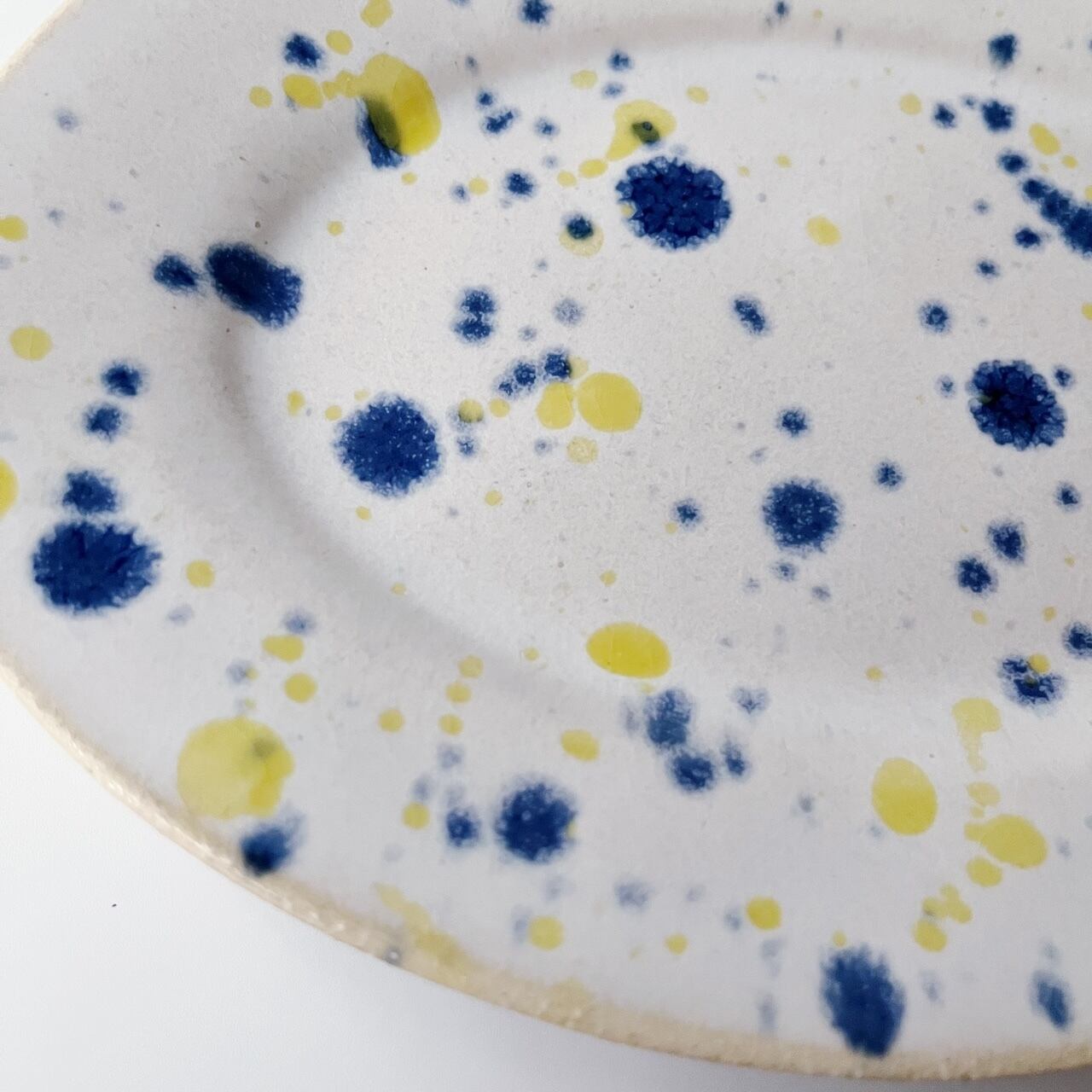 白地をベースに、青と黄色の釉薬を垂らしてドット柄を作っているため、